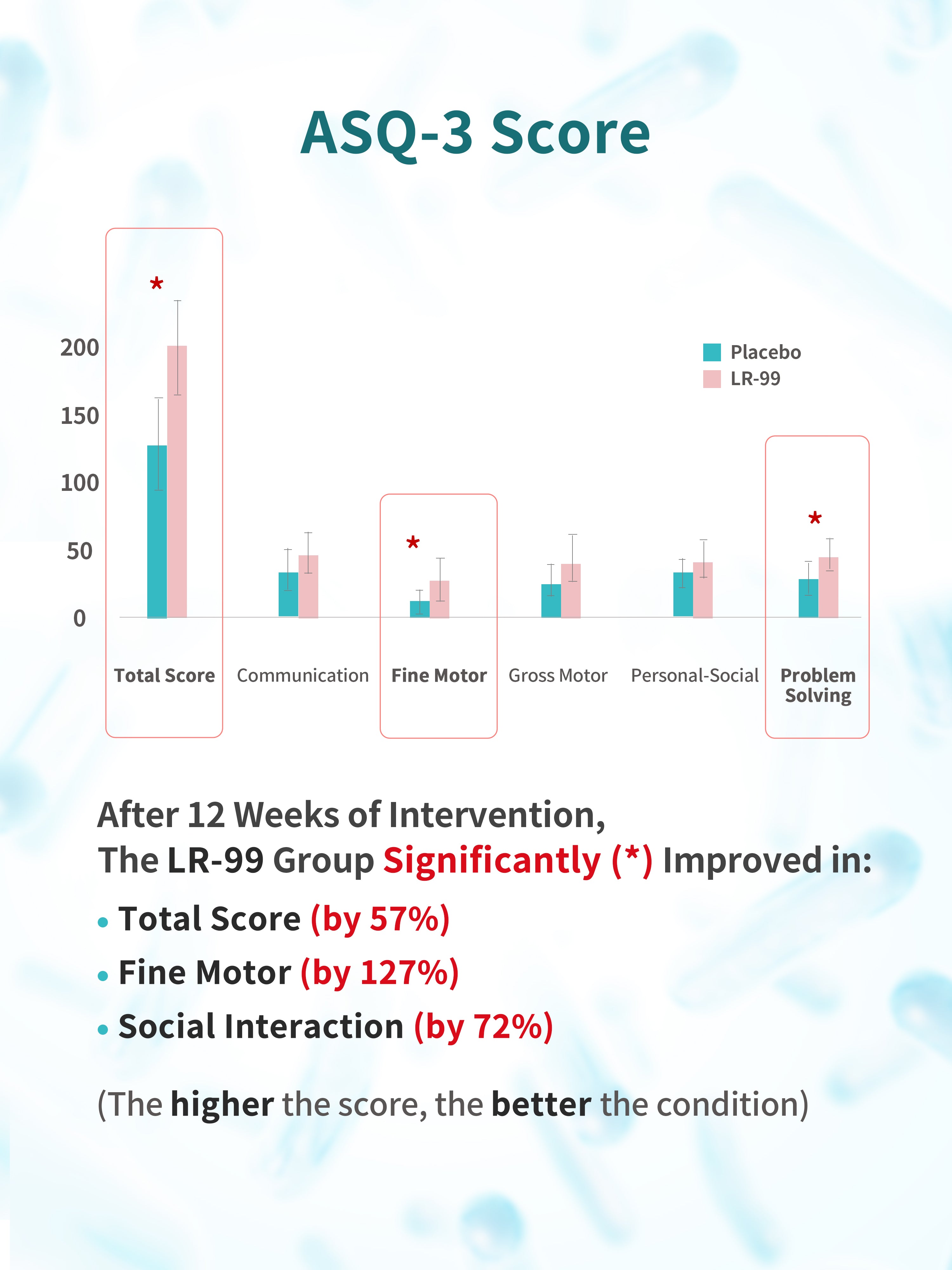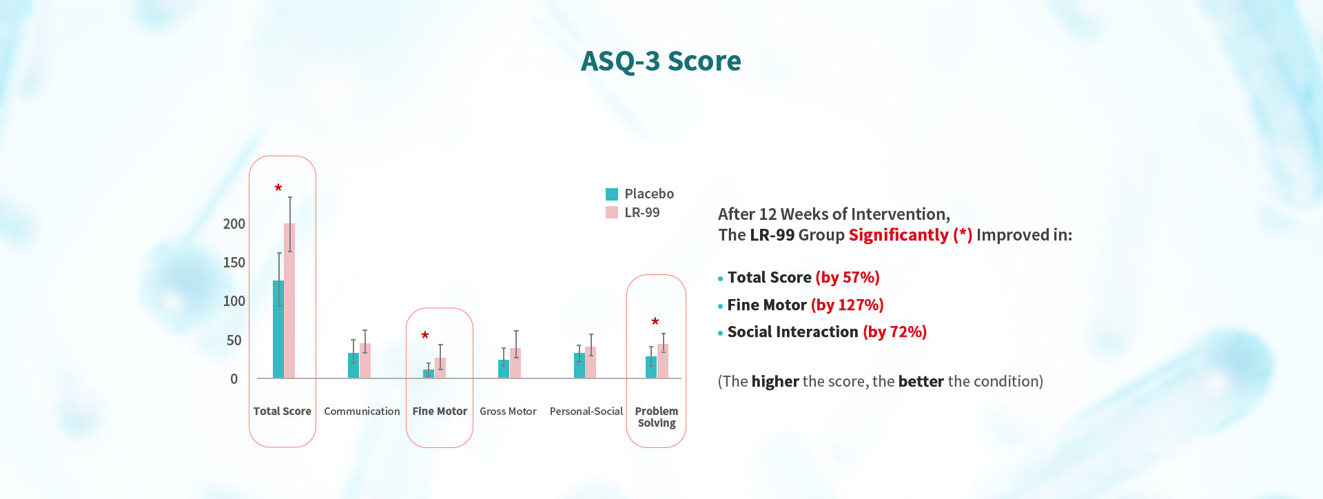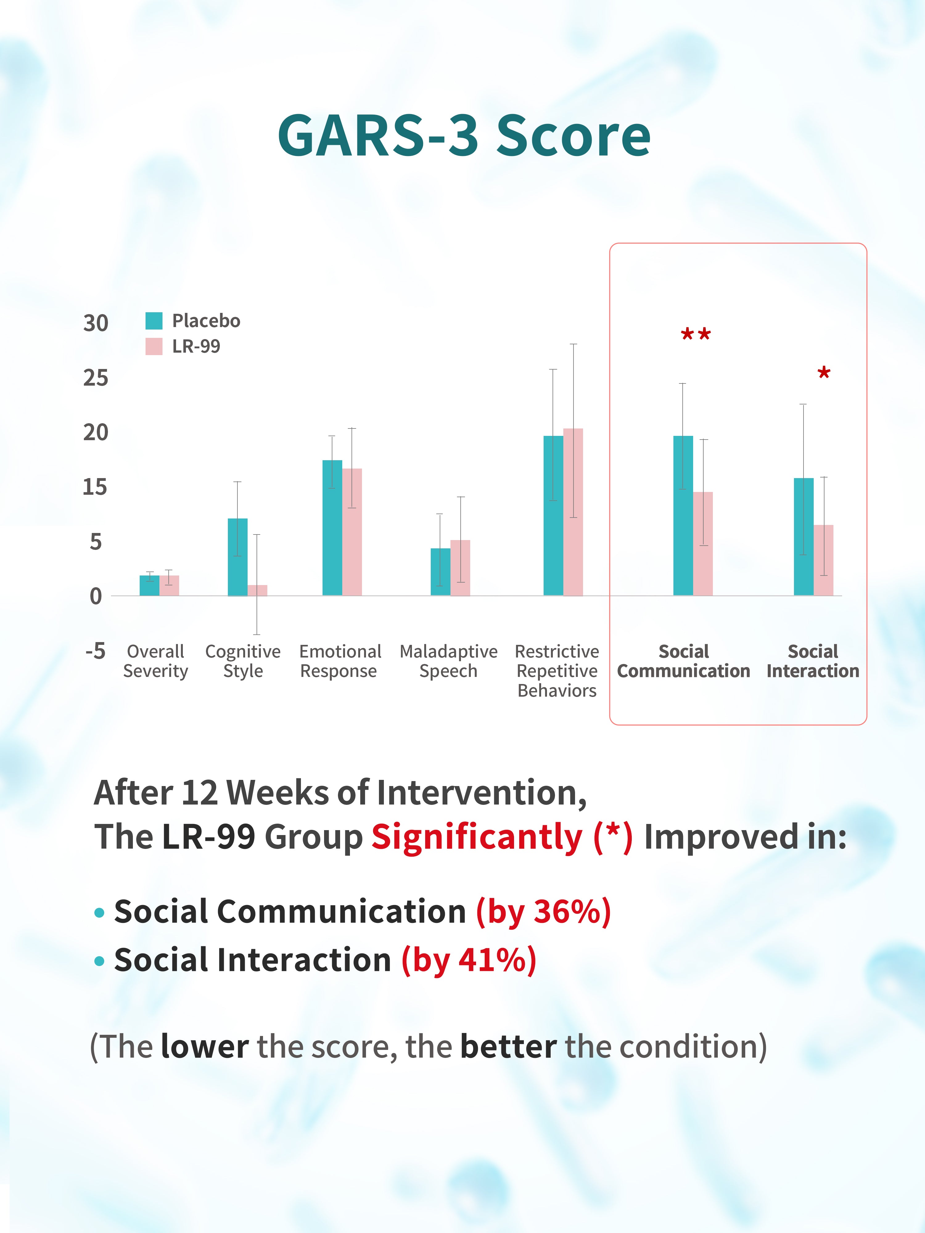 - Featuring Patented Core Strain LR-99 – clinically proven to improve core symptoms of autism spectrum disorder (ASD)