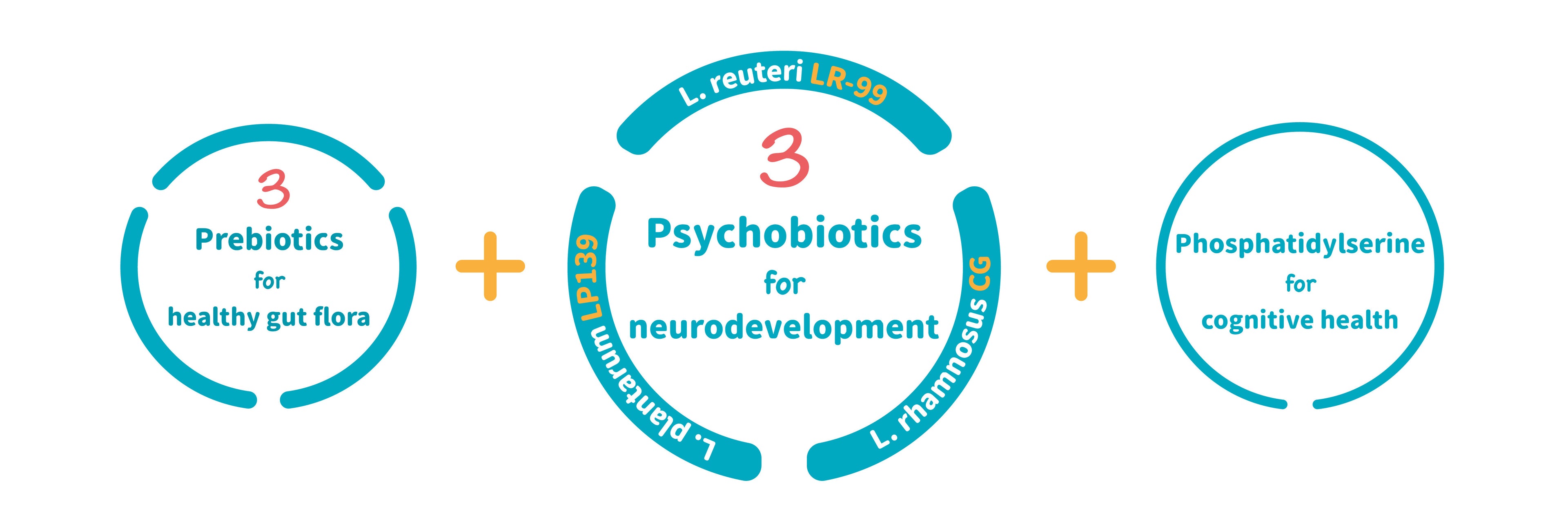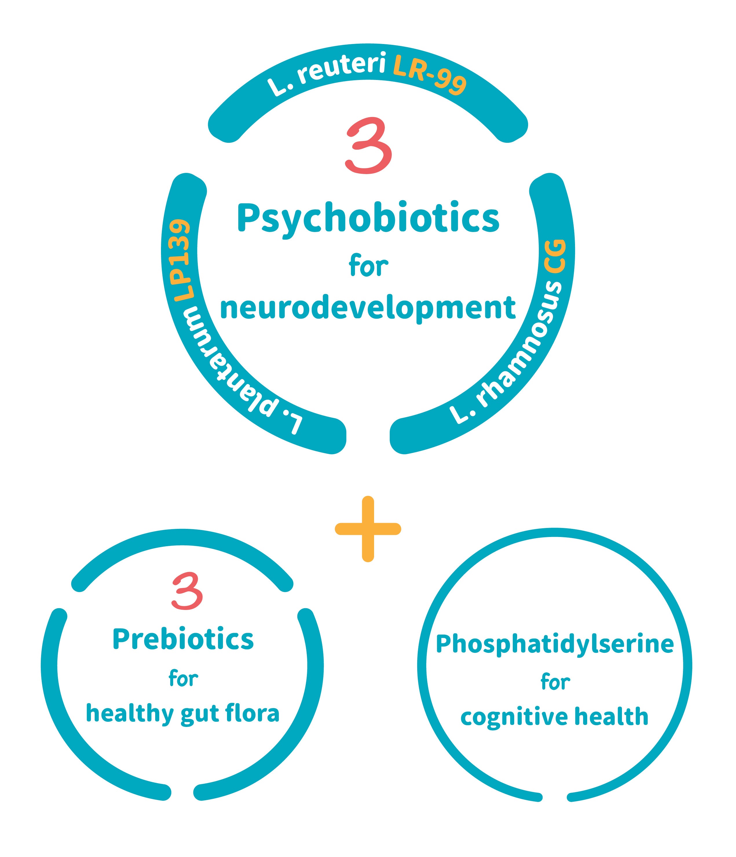 - Specialized Formula – a blend of 3 psychobiotic strains + 3 prebiotics + phosphatidylserine [Learn More]